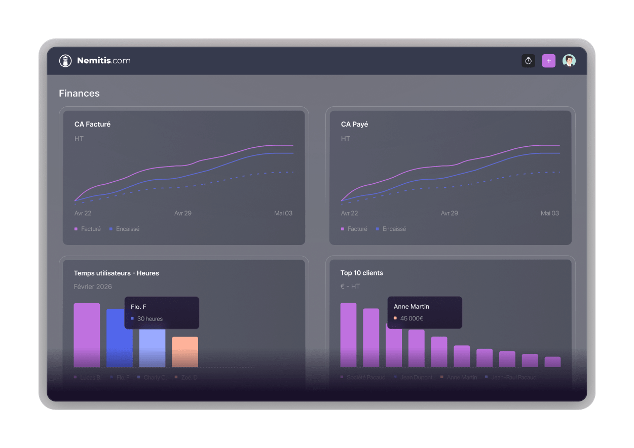 Visualisez vos encaissements, vos temps et vos clients les plus importants.